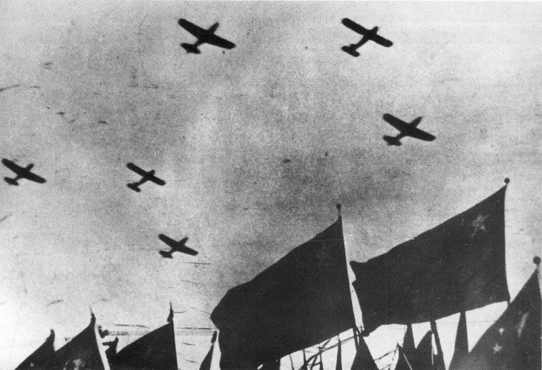 1949年10月1日,中华人民共和国开国大典阅兵,17架飞机组成的飞行编队飞过天安门广场上空。新华社发