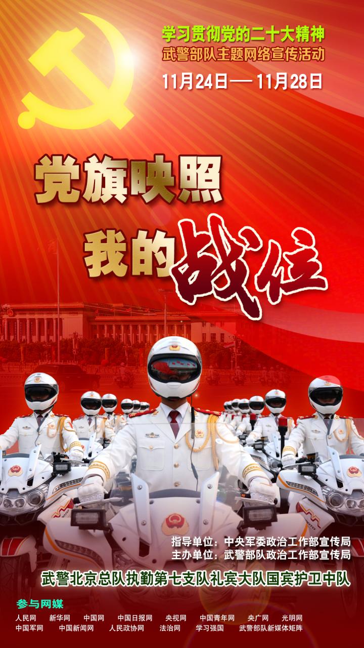 人民网北京11月24日电 党旗所指,军心所向。党的二十大召开以来,从南国小岛到北国边疆,从茫茫草原到雪域高原,从繁华都市到偏远山村,驻守祖国各地的武警官兵正以最大的政治热情和政治自觉,投入到深入学习贯彻党的二十大精神中来。为充分展现学习贯彻的火热场景和生动实践,着力反映忠诚维护核心、矢志奋斗强军的坚定意志和崭新风貌,近期武警部队策划组织了“党旗映照我的战位”主题网络宣传活动,邀请人民网、新华网等多家主流网络媒体,对武警北京总队执勤第七支队礼宾大队国宾护卫中队、山东总队临沂支队执勤一大队机动中队、河南总队开封支队执勤二大队兰考中队和第二机动总队某支队养护十七中队4个先进基层单位进行采访报道。