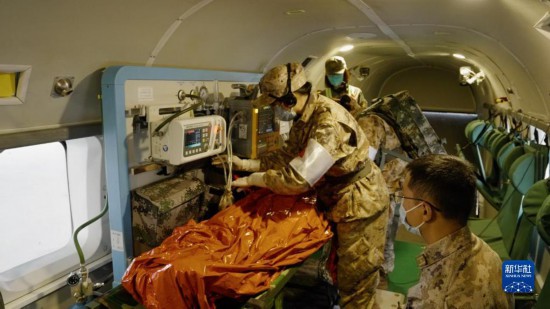 11月20日,在“卫勤力量-2022A1”基地化训练中,直升机后送医疗组对“重症伤员”进行机上救护(视频截图)。新华社发(梅宇阳 摄)