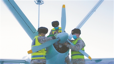 新疆军区某旅无人机侦察一连机务人员起飞前检查飞机。 谢亮摄