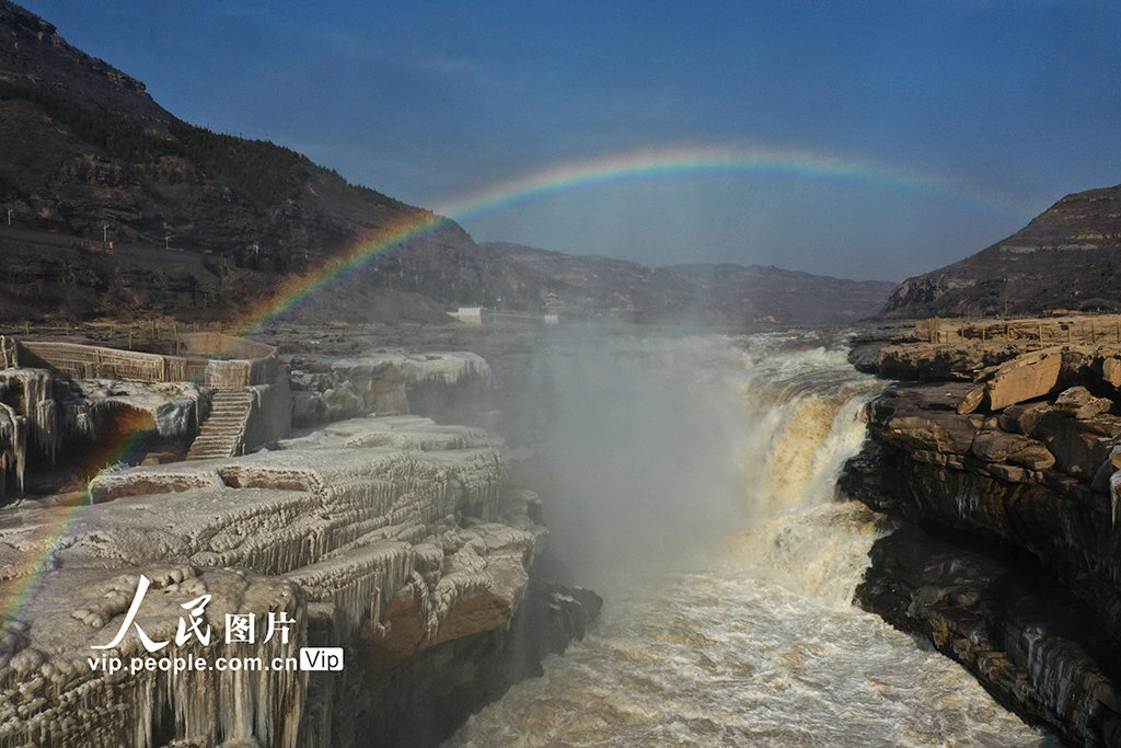 山西吉县:黄河壶口瀑布冰挂彩虹景色美