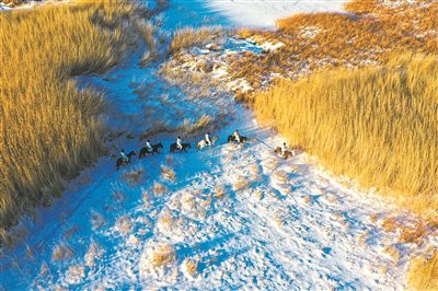图①:官兵骑乘军马穿越芦苇荡,向着执勤点位前进。