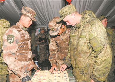 有几个细节,让笔者一直记忆犹新。参演官兵是和平的捍卫者,也是友谊的传递者。握手、拥抱和合影,是联演期间各国官兵之间最频繁、最生动和最温暖的画面。“东方-2018”战略演习文化交流和慰问演出中,《莫斯科郊外的晚上》让两国官兵的互动交流达到一个小高潮,语言的隔阂与文化的差异在动人的旋律中消融。中俄两军官兵围坐一起,双方吹奏起《月光下的凤尾竹》《喀秋莎》,韵律婉转流淌。文化体验馆中,俄罗斯士兵与中国士兵一起在蛋壳上雕刻出“友谊万岁”四个汉字。巨幅米贴画“祖国在我心中”,中国官兵邀请俄军官兵一同用各色各样的米粒贴出中国版图……