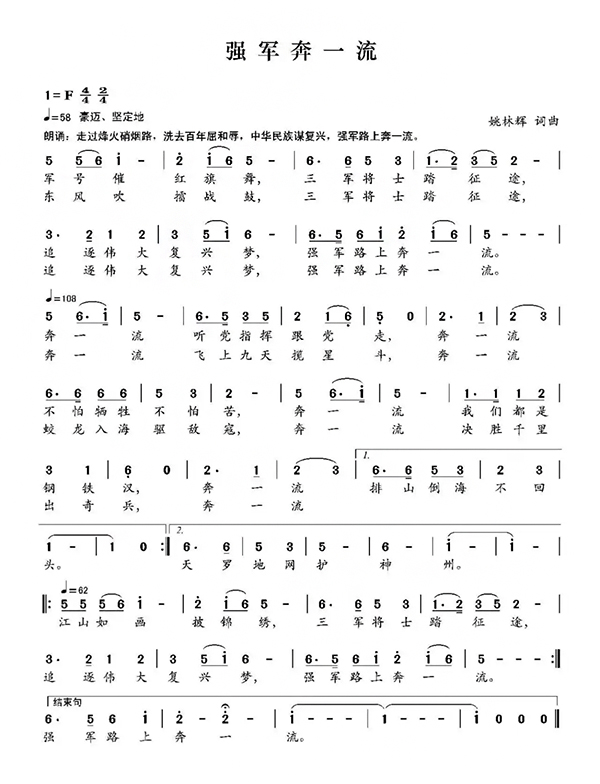 党的二十大吹响了加快把人民军队建成世界一流军队的催征号角,人民军队闻令而动,朝着建军一百年奋斗目标勇毅前行。“号角响,旌旗奋,三军将士踏征途,追逐伟大复兴梦,强军路上奔一流”。由南部战区陆军政治工作部出品,著名歌唱家阎维文、姚林辉演唱,姚林辉作词作曲的作品《强军奔一流》,通过人民军队以排山倒海之势奋楫强军的恢宏场景,展现广大官兵听党指挥、敢打必胜的英雄气概。