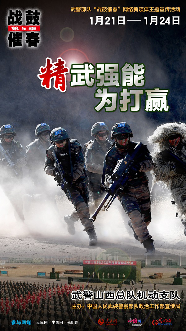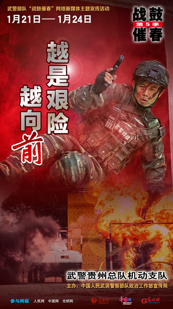 为生动展现春节期间武警部队执勤训练、工作生活的火热场景和感人瞬间,武警部队政治工作部宣传局将接续推出“战鼓催春”网络新媒体主题宣传活动,集中对山西总队机动支队、贵州总队机动支队、第一机动总队某支队等军事训练先进单位展开网上宣传,通过图像、文字、视频等多种形式,带领大家去感受武警官兵忠诚担当、无私奉献的精神风貌和人民武警为人民、人民武警爱人民的宗旨情怀。