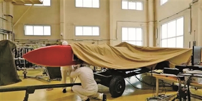 俄国防部展示的在总装车间的“海燕”核动力巡航导弹(视频截图)。