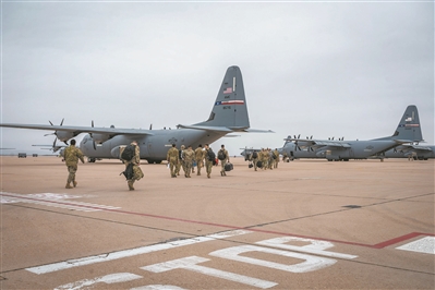 2月25日,美空军飞行员准备驾驶C-130J运输机前往得克萨斯州戴斯空军基地。