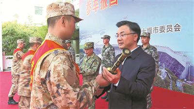 3月16日,湖北省十堰市委书记黄剑雄(右一)向新兵赠授“崇军尚武”武当剑。尚绪文摄