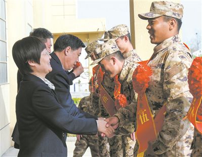 3月15日,山东省郓城县县长张晖(左一)鼓励新兵建功军营。魏忠友摄