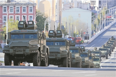 5月7日,俄罗斯首都莫斯科举行卫国战争胜利日阅兵式彩排。图为当日在莫斯科拍摄的即将参与彩排的装甲车。