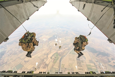 近日,空降兵某部组织伞降实跳训练,锤炼官兵实战能力。