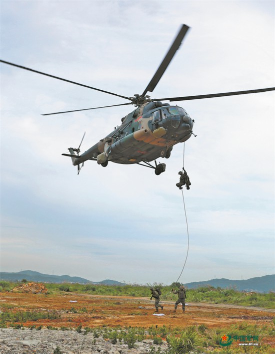 火力打击过后,数架运输直升机从不同方向突入“战场”,快速实施索降和机降。着陆后,突击队员采取多路并进方式,对“敌”残余力量展开围剿。