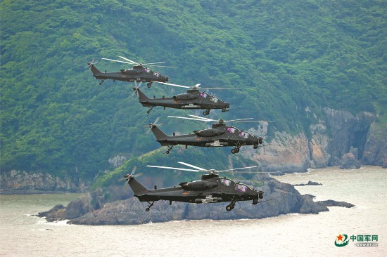 塔台下达起飞指令后,数架武装直升机接续升空,快速完成战斗编组。飞行途中,战机根据战场情况不断变换战斗队形,时而低空掠海飞行,时而借助地形隐蔽突防。