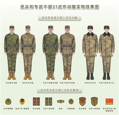 21式作训服配发对象为已编组注册的基干民兵和按规定选拔任命的专武干部。配发品种主要是丛林迷彩夏作训服、荒漠迷彩冬作训服、荒漠迷彩作训大衣和配套的标志服饰,以及07式短袖体能训练服、腰带、作训鞋。21式作训服主要在参加军事机关统一组织的编兵整组、教育训练、战备勤务、执行任务等活动时穿着,其他时间和场合确需使用,必须报省军区师级以上单位批准。严禁军训学生、职工、聘用人员等非民兵和专武干部身份人员穿着使用。民兵和专武干部目前使用的各类军服和标志服饰,将于2023年12月31日前停止使用。(王凌硕)