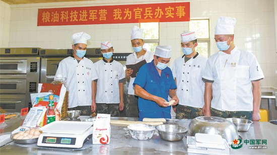 在广东省军粮供应服务中心组织的“粮油科技进军营”活动中,面点师傅为官兵传授技艺。叶晓华摄
