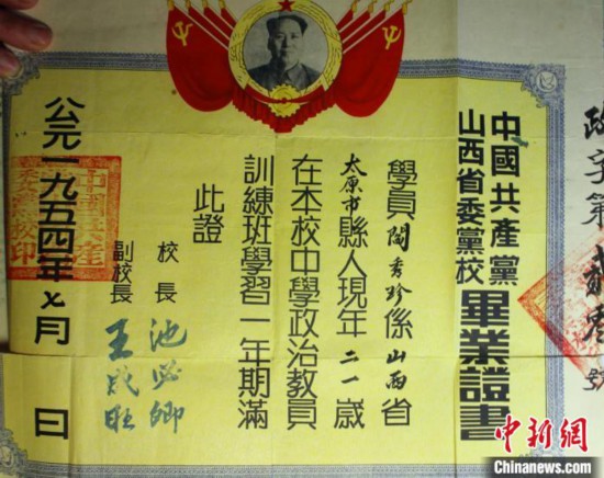 闫秀珍的毕业证(翻拍老照片)。杨俊钦摄