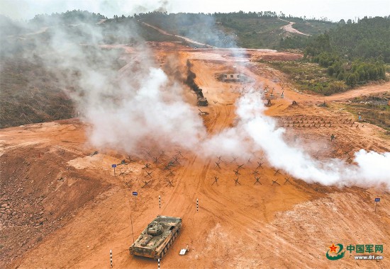 第74集团军某旅组织开展山地进攻战斗演练。图为多支不同兵种力量合力展开破障行动。李硕勋摄