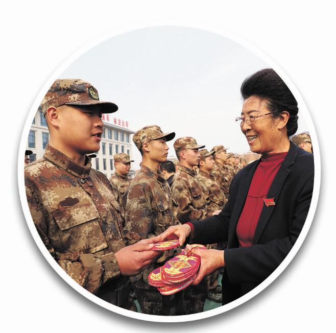 图①:“十佳沂蒙新红嫂”李光芹(前右)在县民兵训练基地看望预定新兵。徐兴春摄