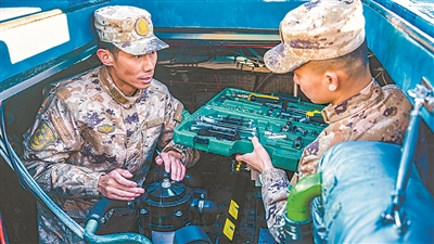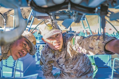 李小兵(左)指导战友排除巡逻艇机械故障。郭中正摄
