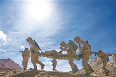 近日,新疆军区某团组织战场救护训练,锤炼官兵在复杂情况下的综合救护能力。