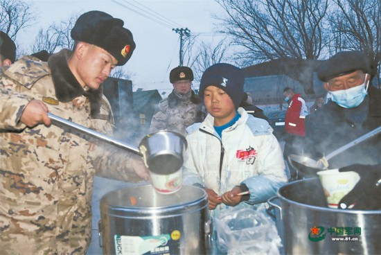 12月20日,武警青海总队机动第一支队官兵在民和县中川乡草滩村安置点为受灾群众提供热食保障。罗元凯摄