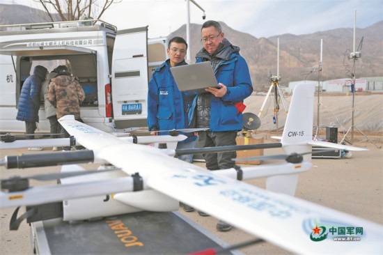 12月20日,在积石山县大河家镇大河村安置点外,中国移动(成都)产业研究院技术人员调试无人机应急通信设备。陈斌摄