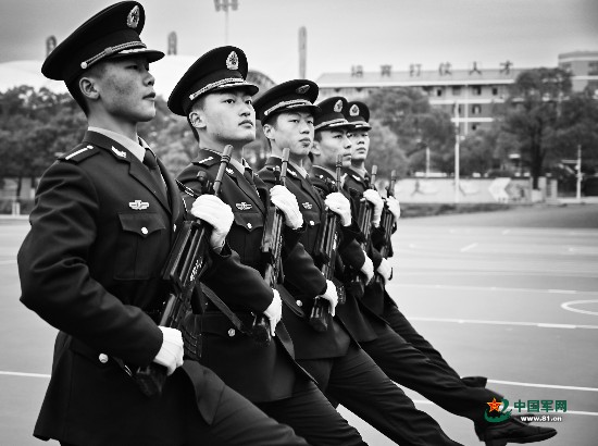 正步走第一步,战友们的腿同时抬起,砸地的声音铿锵有力。一个来回过去,他们的呼吸变得急促,后背也开始冒汗,但神色依旧凝重如山。赛后班长对他们说:“你们的每一步都让人为之瞩目,又齐又响。”