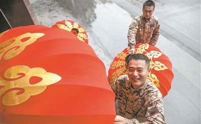 春节前夕,武警安徽总队组织文职人员与官兵一起悬挂灯笼。王祎鑫摄