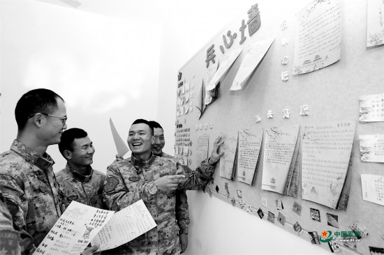 官兵驻足“兵心墙”前交流讨论。唐田 摄