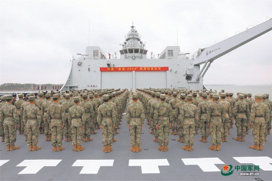 5月9日,执行中柬“金龙-2024”联演任务的中方参演部队,在湛江某军港码头举行出征仪式。南部战区海军某部祁连山舰的起降平台上,来自战区陆军、海军、空军和联勤保障部队的300余名参演官兵整齐列队,听令出征。仪式结束后,中方参演兵力通过海上输送方式向演习地域机动集结。