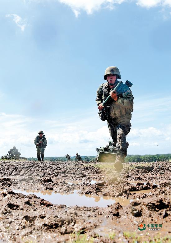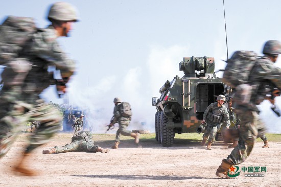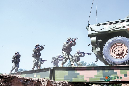进攻战斗训练中,官兵快速下车。