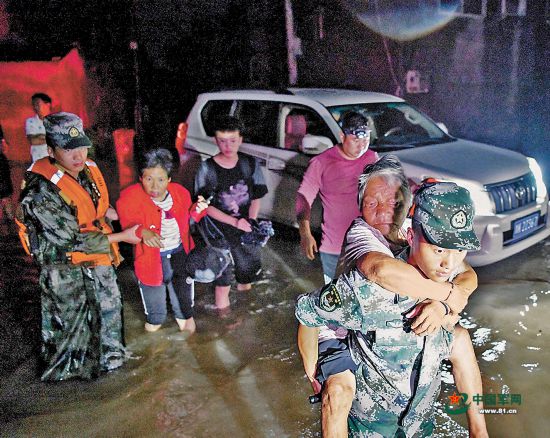2021年7月,官兵参加抗洪抢险时转移被困群众(资料照片)。