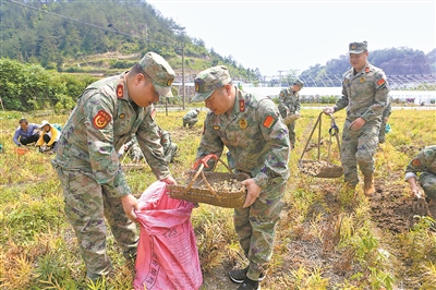 近日,浙江省磐安县人武部组织民兵前往新渥街道庄基社区,帮助药农采收中药材。