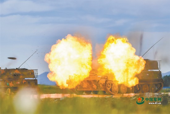 “放!”指挥员下达指令。刹那间,阵地上火光四射,一发发炮弹呼啸而出,拖拽着尾焰直扑目标。对“敌”实施一轮精准打击后,各炮班快速撤收火炮,向预备阵地转移。