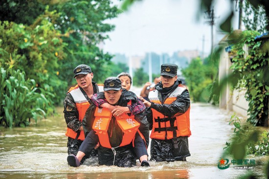 连日来,河南省南阳市多地出现强降雨。7月15日,接到救援命令后,武警河南总队南阳支队官兵迅速出动,展开抢险救援。图为武警官兵解救受困群众。何英杰 摄