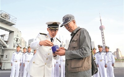在人民海军成立七十六周年之际,海军在多个城市港口同步举行舰艇开放活动。图为在上海举行的舰艇开放活动中,一名游客与沂蒙山舰官兵交流。