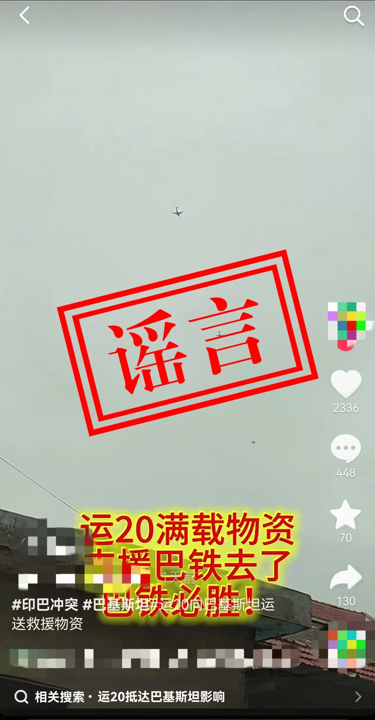 人民网北京5月12日电 (任佳晖)据人民空军微信公众号消息,近日,网络上出现大量关于“运-20向巴基斯坦运送救援物资”的消息。对此,人民空军表示,此消息为不实信息!网络不是法外之地!制作传播涉军谣言需负法律责任!