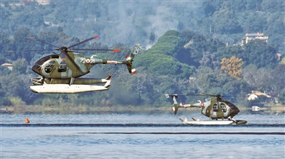 在罗马西北约30千米外的布拉恰诺湖上,意大利空军的2架NH-500E“小鸟”轻型直升机正在进行水上训练。直升机下方的滑橇起落架加装的一对巨大浮筒,看上去像穿了一双特制的“靴子”,让飞行变得迟缓了许多。不过,正因为有了这双能在水上漂浮的“靴子”,“小鸟”直升机实现水上起降,成为名副其实的“水鸟”。