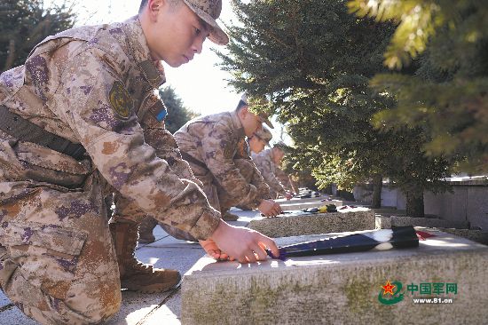 新兵户嘉琦在烈士王靖声墓前屈膝蹲下,轻轻拂去碑上积雪,仔细擦拭烈士英名。1952年5月25日,23岁的某团二大队大队长王靖声在战斗中为掩护战友,向敌双机攻击,壮烈牺牲。户嘉琦对记者说:“我来自狼牙山五壮士跳崖所在地,入伍前我特意又去了一次五壮士跳崖处。只要祖国需要,我会像五壮士和王靖声烈士一样,毫不犹豫地献出生命。”